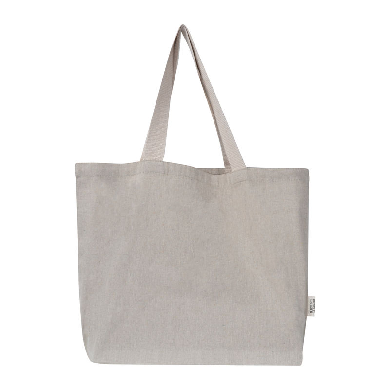 Tato taška s gramáží látky 200 g/m² zajišťuje odolnost a pevnost pro každodenní použití. Je ideální pro nákupy, volnočasové aktivity i různé akce. Prostorný rozměr nabízí dostatek úložného prostoru, zatímco materiál z recyklované bavlny zdůrazňuje udržitelnost – ideální pro výrazné a udržitelné brandování.