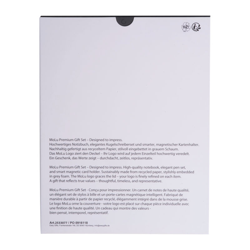 Navrženo, aby zanechalo dojem. Kvalitní zápisník, elegantní sada kuličkových per a chytrý magnetický držák karet. Udržitelně vyrobené z recyklovaného papíru, stylově uložené v šedé pěně. Logo MoLu zdobí víčko. Dárek, který ukazuje hodnotu – promyšlený, nadčasový, reprezentativní.
