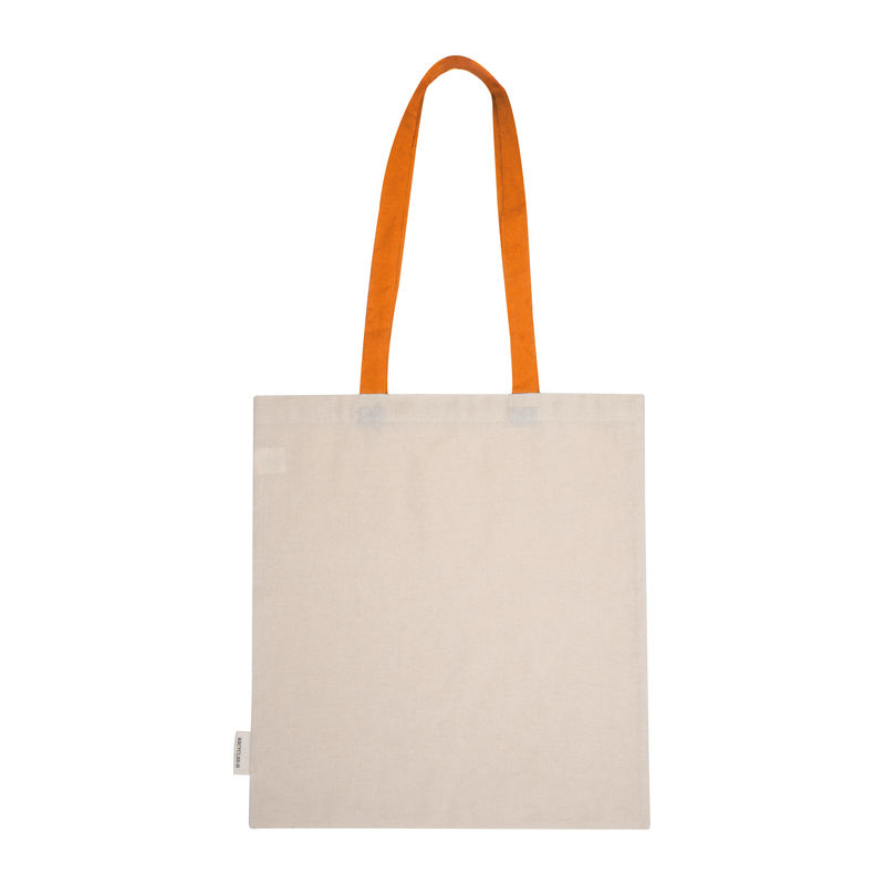 Bavlněná nákupní taška z certifikované bavlny Oeko-Tex® se dvěma dlouhými úchyty, vyrobená ze 75 % recyklované bavlny a 25 % recyklovaného PET. Gramáž látky: 140 g/m².