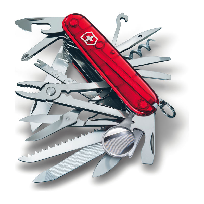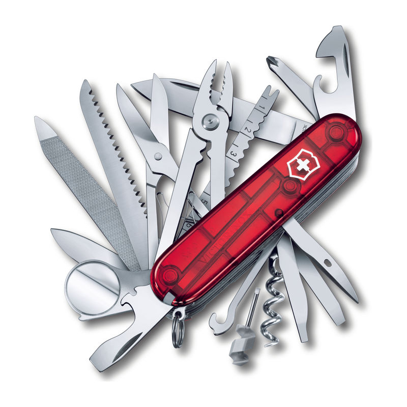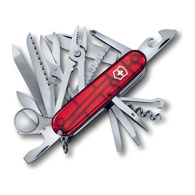 Vlastnosti: 1. velká čepel 2. malá čepel 3. vývrtka 4. otvírák na konzervy s 5. malým šroubovákem 6. otvírák na lahve s 7. šroubovákem 8. odizolovač drátů 9. šídlo 10. kroužek na klíče 11. pinzeta 12. nůžky 13. párátko 14. multifunkční hák (nosič balíků) 15. pila na dřevo 16. šupinovač 17. vyháčkovací nástroj 18. pravítko (cm i palce) 19. pilník na nehty 20. pilník na kov 21. čistič nehtů 22. pilka na kov 23. jemný šroubovák 24. dláto/škrabka 25. kleště 26. krimpovací nástroj 27. řezač drátů 28. křížový šroubovák 29. lupa 30. kuličkové pero 31. nerezová jehla 32. minišroubovák 33. očko pro šití.