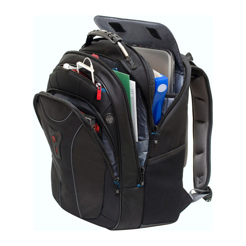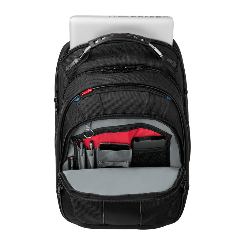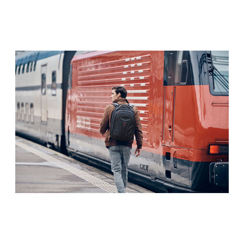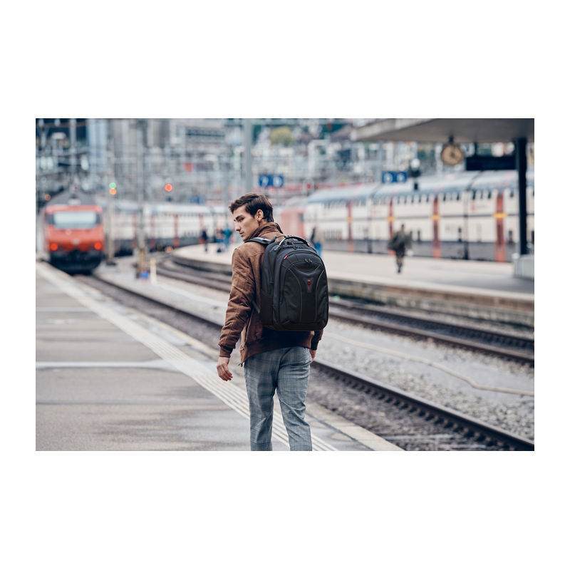 Lehký batoh na notebooky do 17" se stabilizační platformou, ventilovaným zádovým polstrováním, ramenními popruhy tlumícími nárazy, ergonomickým madlem, kapsou pro rychlý přístup, síťovanými bočními kapsami a průchodkou umožňující nasazení batohu na teleskopickou rukojeť kufru.