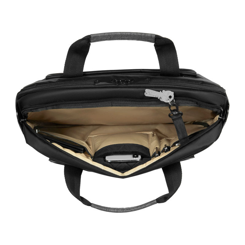 16" / 41 cm laptop briefcase with tablet / eReader pocket. Dual handles and removable shoulder strap. Rear pocket unzips to become a Pass-Thru trolley sleeve for easy travel with wheeled luggage.